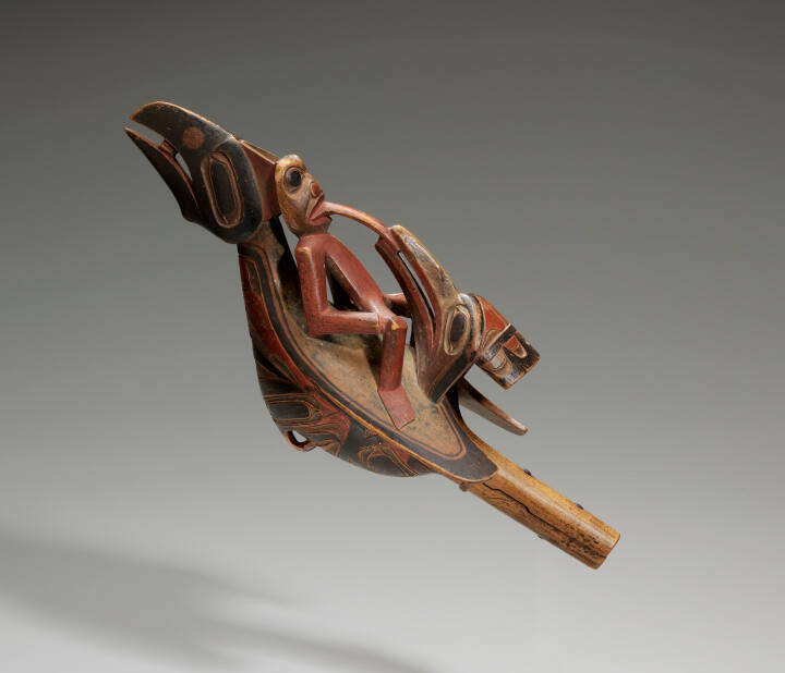 DescriptionRattle with stylized bird (raven?) motif. Long handle. Figure with long tongue connects to beak of second bird. The figure's head leans forward on bird's head.Gallery LabelRenowned Northwest Coast scholar Bill Holm has remarked that the raven rattle is the best known, least understood and most controversial of all Northwest Coast objects. According to the earliest recorded native authorities, rattles of this type have always been known as a chief's dancing rattle. Many scholars, however, believe the form began as a powerful shaman's object. Raven rattles are distinguished by their complex, integrated form. The overall configuration represents a raven; reclining on its back is a human whose tongue is joined with the beak of a second facing raven, symbolizing the transfer of supernatural knowledge and power. On the breast is a face of a third bird with recurved beak, which likely represents yet another manifestation of the mythic raven.