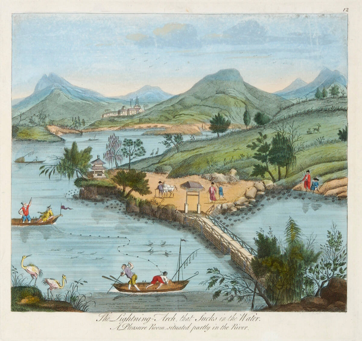 DescriptionLower left corner, rock with two cranes, bottom center, boat with rower and man holding end of net which extends to another boat, left margin, with two occupants. From tree-y rock, lower right corner, bridge to shore, center, where gateway, pavilion, and pedestrians in cleared area. Green slope, center right. Water and mountains in rear, where small town, left of center.Exhibition HistoryOccidental Graphics from the Collection of Laurence Sickman, The Nelson-Atkins Museum of Art, Kansas City, MO, September 13- October 18, 1992, no. 43.