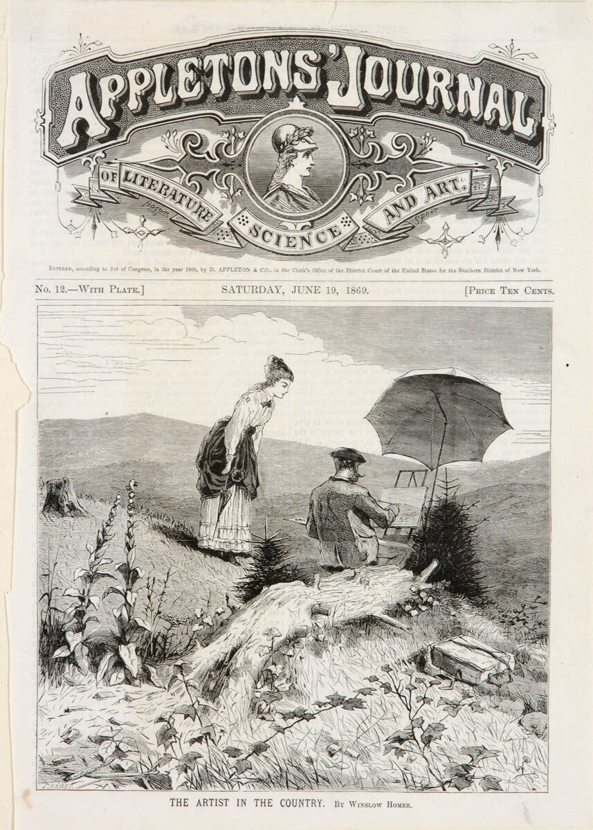 DescriptionSeen from rear, hatted man, seated on end of fallen tree trunk, holds palette and paints on canvas on easel shaded by umbrella, right, observed by standing woman, left, leaning forward to peek at picture. Range of hills in background. Pack on rocky ground, right, tall flowering plants, left.Gallery LabelFor the first 18 years of renowned painter Winslow Homer's career, his success was based largely on drawings reproduced as wood engravings in popular periodicals. Homer's drawing The Artist in the Country, which John Karst engraved, appeared on the front page of the 19 June 1869 issue of Appletons' Journal. It references the phenomenon of American artists leaving their studios to paint en plein air, or outdoors. Although many images depicted unspoiled wilderness, the tree stump at the left of this composition and the fashionably dressed woman suggest increased access to once-remote landscapes. The artist at his easel stands in for Homer, who created the drawing from sketches made in New Hampshire's White Mountain region during August 1868.