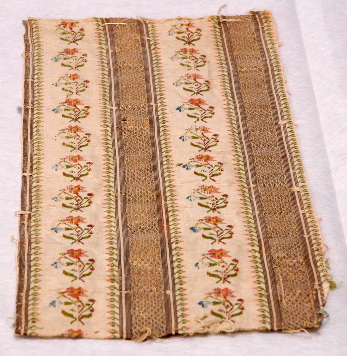 DescriptionPale blue and gold thread, stripe of flower shrub and silver in green, rose and blueExhibition HistoryNo exhibition history known at this time.