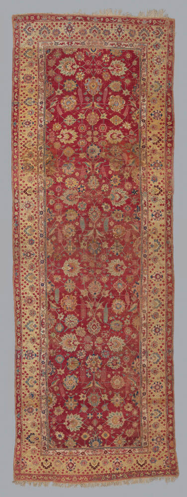 DescriptionDeep red background, all over Persian floral design in blue, yellow, and green. Tan border.Provenance