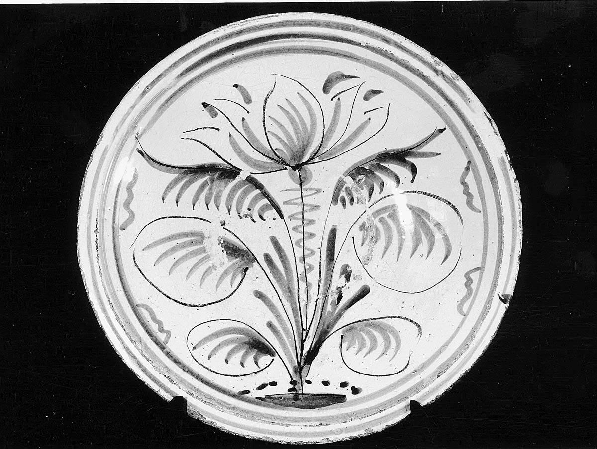 DescriptionFormal tulip design lightly drawn in blue and puce on white ground, encircled by three linear blue borders.