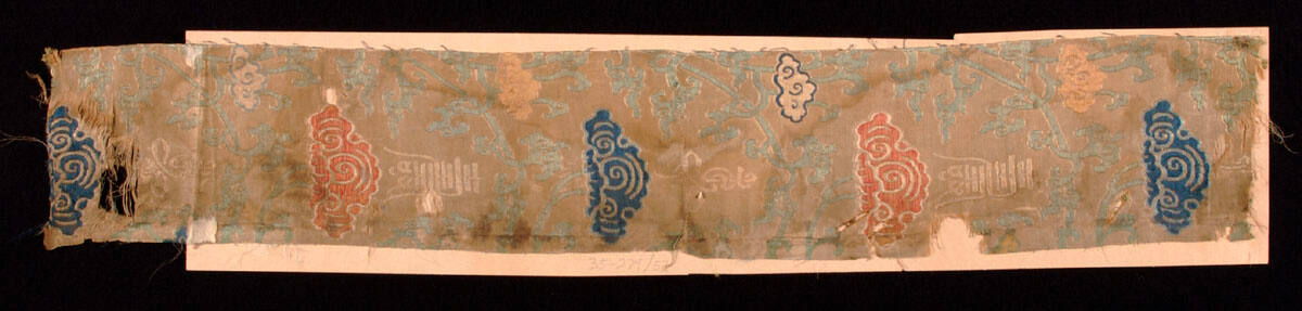 DescriptionTan satin ground brocaded in blue, red and yellow flowers and green tendrils. Tan characters on background.