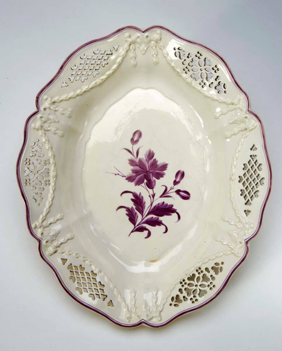 DescriptionShaped oval contour serving dish with reliefs of swags and cascades. Purple banding on rims decorated with purple floral sprays. Pierced designs.Provenance