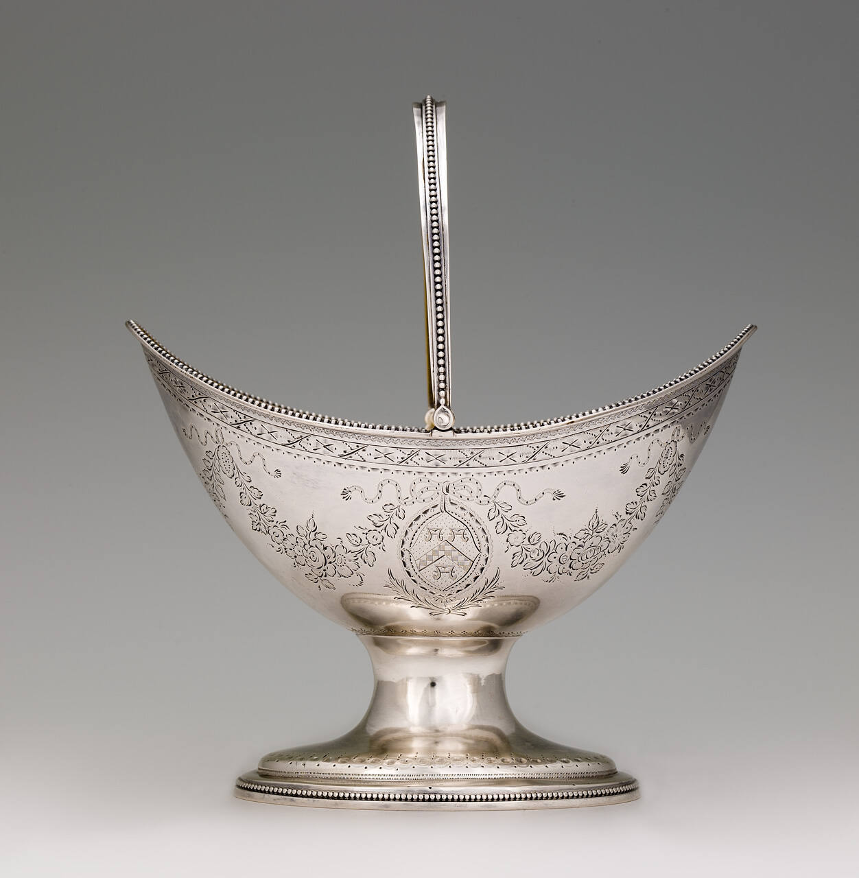 DescriptionOval-shaped basket on an oval collet foot, with swing handle; bead decorated on foot, edge of body, and handle. The body is decorated with "bright cut" work of flowers and leaves. One side engraved with a coat-of-arms within an oval shield; the other side is engraved with initials.