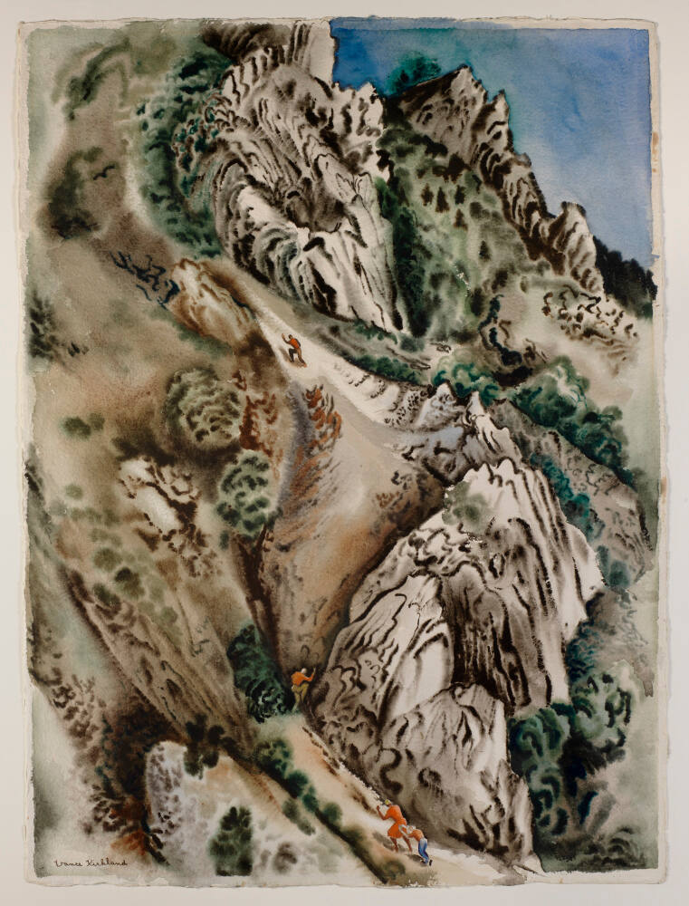 Gallery LabelSeen from above and dwarfed by the muscular rhythms of stone outcroppings and pines, four mountain climbers make their way upward along a winding path toward an unseen peak. By cropping the image, Vance Kirkland suggests the vast scale and power of the Colorado Rocky Mountain range that lies beyond the paper's edge. The climbers' journey is not undulating and poetic, but direct and strenuous; some may not reach the crest. Unlike Chinese mountain scenes, this has no comforting huts or carts, no harmonious waterfalls and no branches swaying in the breeze. Kirkland paints a bold, expressive vision of a stern and dramatic world.