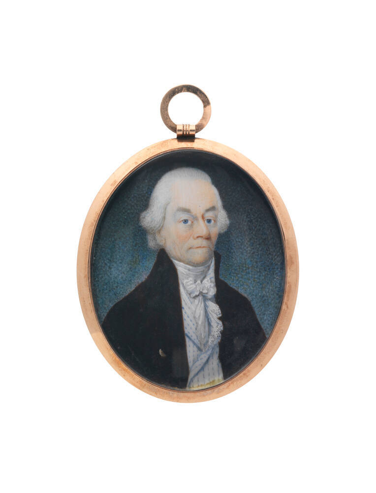 DescriptionBust-length portrait miniature of a man with white hair wearing a white shirt and tie and a black coat. His head is turned slightly proper left. The object includes a glass cover.