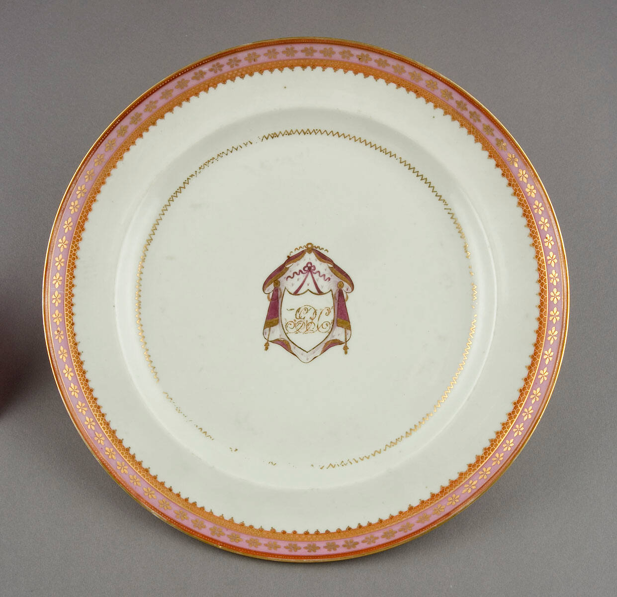 DescriptionNarrow borders in pink, red, and gold. Initials G.P.C. within shield.