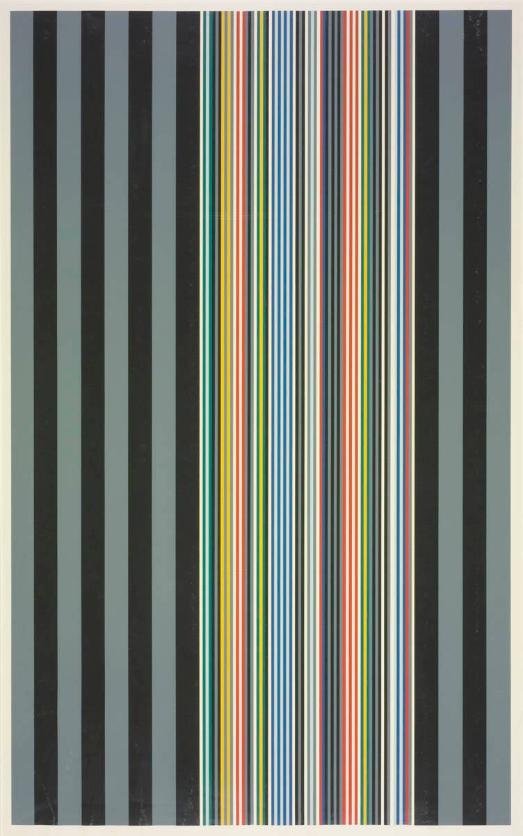 DescriptionBoth on white ground. Right--between wide vertical alternating stripes, left, four grey, four black; right, two grey, two black, groups of narrow stripes in color, black and grey: 10, 1, 4, 4, 7, 3, 3, 9, 1, 1, 7, 2, 6 separated by white stripes.Copyright© Estate of Gene Davis
