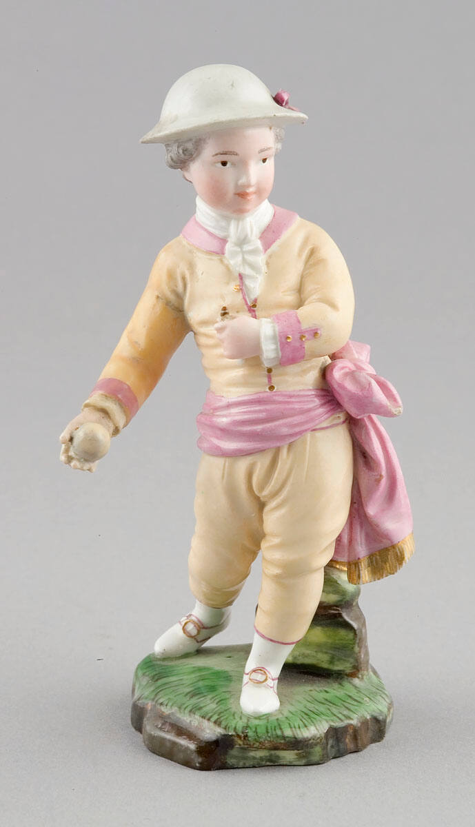 DescriptionYoung boy in tan suit with pink trim and large pink bow at waist; white hat with small pink bow; ball in right hand, unidentified object in left hand. Left foot forward. On shaped green base.ProvenanceCaroline Newman Newburger Berkowitz (1899–1997), Kansas City, MO, by June 25, 1970 [1];