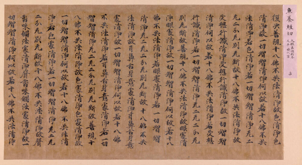 Gallery LabelHandwritten copies of sutras, or sacred Buddhist scriptures, were essential to promoting the faith. All temples required copies for use in ritual recitation. The text is read from top to bottom, right to left. Since the 1400s, collectors prized the beauty of scribes’ calligraphy. Many sutras were cut up like this fragment and pasted into albums as treasured objects, sometimes to preserve the undamaged parts.