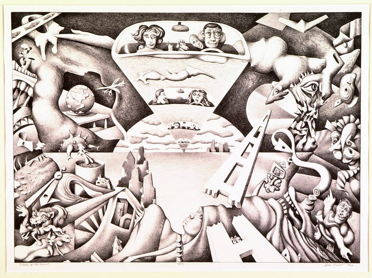 DescriptionTwo horizontal zones, light below, dark above. On bottom part, recumbent figure flanked, left, by tower forms, right by broken openwork pylon. Right corner, composite man with pointing crossed arms behind open-mouthed monster with sliced curling appendage, hand bearing television; masked creatures, right margin. Left corner, demonic figures and sweeping shapes, one open to show man on tightrope. In center, top partk inverted triangle with four diminishing windshield and car occupants, against cloudy white half-moon. Monster forms, right. Left, bioform open to reveal globe on table. Fish creature bottom, with nose siphoning liquid from cylinder.Copyright© Dan Snow