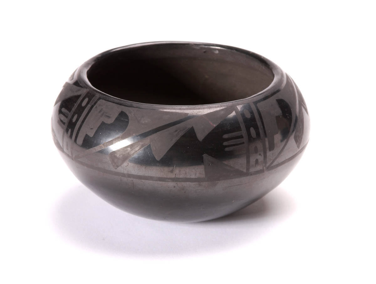 DescriptionA round bowl with a large mouth opening. It is glossy black in color with a matte black stylized geometric design on the surface.
