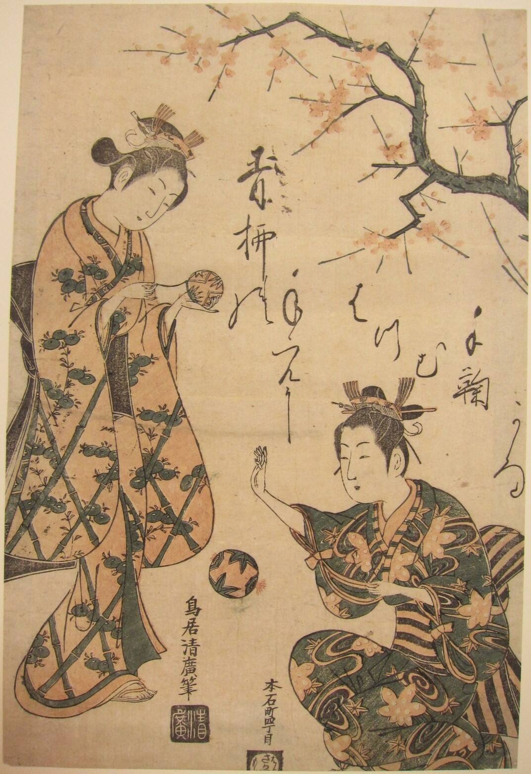 Two Girls Playing Ball Under Plum Blossoms