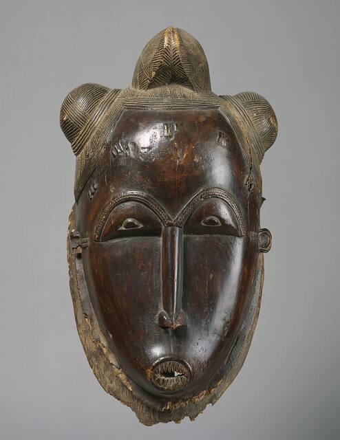 This mask is associated with Goli, a day-long masquerade performed for entertainment and for the funerals of prominent persons. The performance consists of four male-female pairs of masks appearing in sequence. The first two pairs signify the wildness and power of the bush, while the second two represent civilized humanity and ordered village life.  The final pair, to which this mask belonged, was the most important and was known as kpan, the senior female. The mask's balanced, harmonious features and small mouth, combined with the dancer's graceful, rhythmic movements, express the dignity and majesty of a chiefly senior woman.
