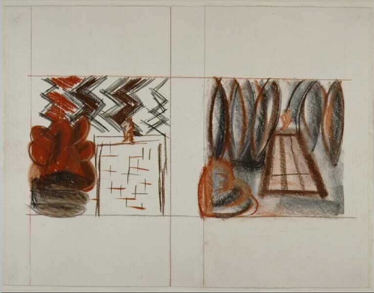 DescriptionDiptych format. Left image depicts flattened "bird's eye" view of empty swimming pool with boy sculpture at upper edge, framed by foliage at left and bold zigzag pattern at top. Right image presents perspectival view of pool, boy sculpture, and elliptical cypress trees.Copyright© Jennifer Bartlett