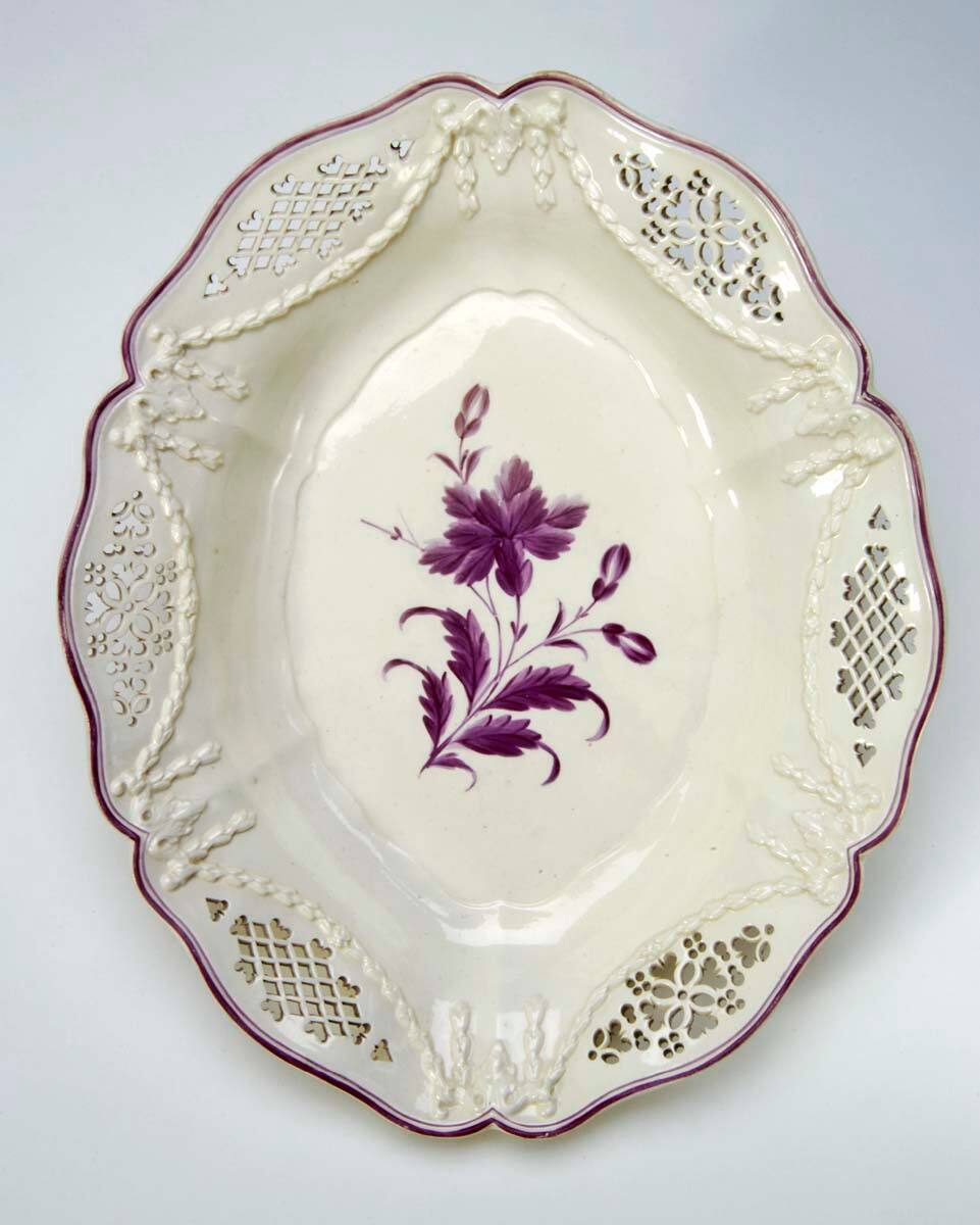 DescriptionShaped oval contour serving dish with reliefs of swags and cascades. Purple banding on rims decorated with purple floral sprays. Pierced designs.Provenance