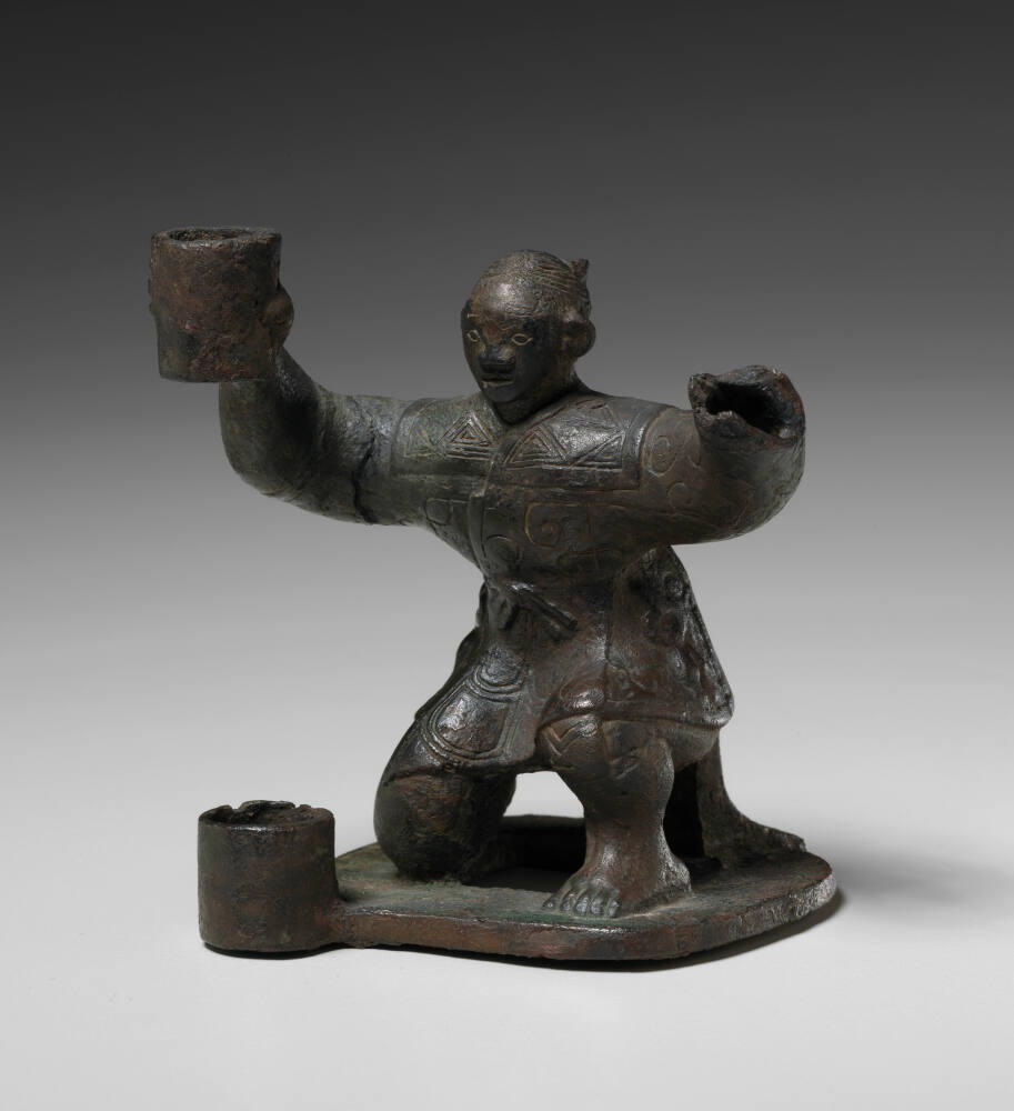 DescriptionKneeling attendant dressed in robes, holding aloft in his right hand a ring in line with a similar ring at his knee. Incised patterns on his robe.