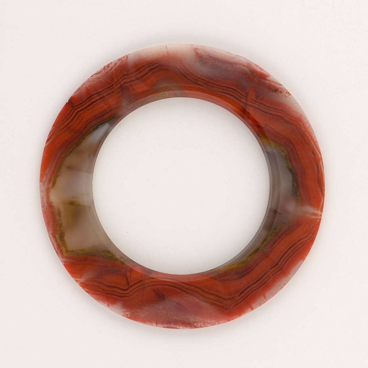 DescriptionOne of a pair of rings in red and white figured agate, possibly used on clothing.