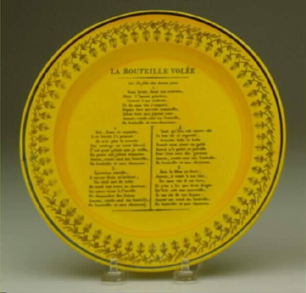 DescriptionTransfer printed in black with the songs "Il Faut Ceder", "Le Petit Homme Gris", "La Bouteille Volee", and "La Fortune"; acorn and leaf decoration on brim.