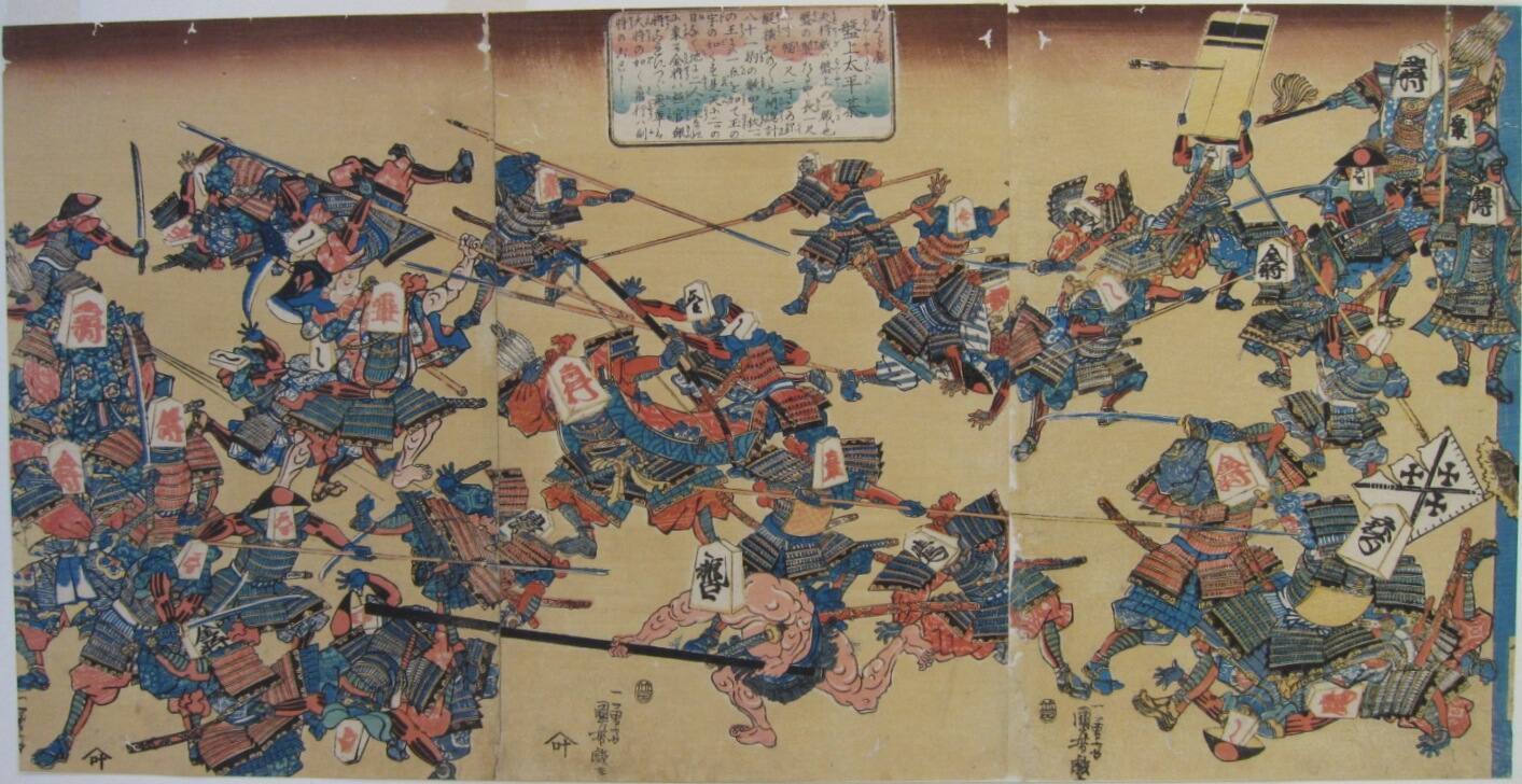 In these prints, the designer Utagawa Kuniyoshi seems to critique the difference between a calmly planned battle strategy and the chaos of an actual battlefield. Kuniyoshi depicted a wild battle between warriors fashioned as pieces in shōgi, a board game similar to chess. The inscription in the middle print suggests that this scene is based on the Chronicle of Great Peace, an epic story of civil wars fought in the first half of the 1300s. Kuniyoshi and the publisher, Gusokuya Kahei, avoided referencing specific warriors or battles to pass government censorship, which restricted criticism against military authority.
