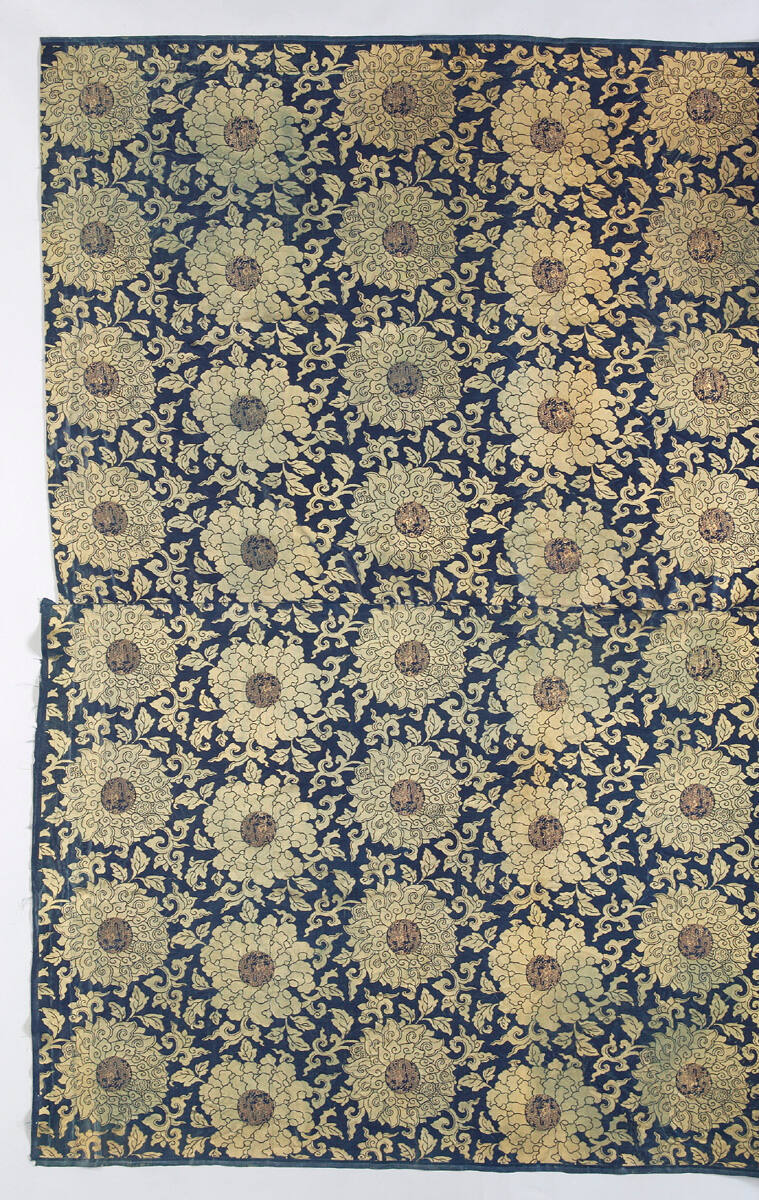 DescriptionBrocade of golden yellow lotus flower and chrysanthemums with gold thread dragons in the center of each flower, brocaded on a faded blue ground.
