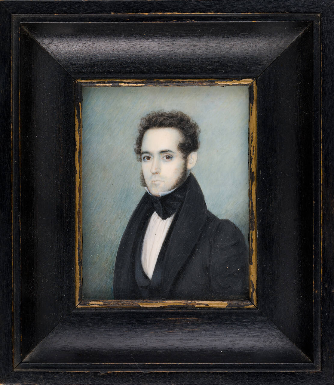 DescriptionThis is a finely rendered, almost half-length portrait miniature of a man with dark, curly hair and long sideburns. Looking to the proper right, he wears a black coat with a large collar, and a white shirt with a black collar.