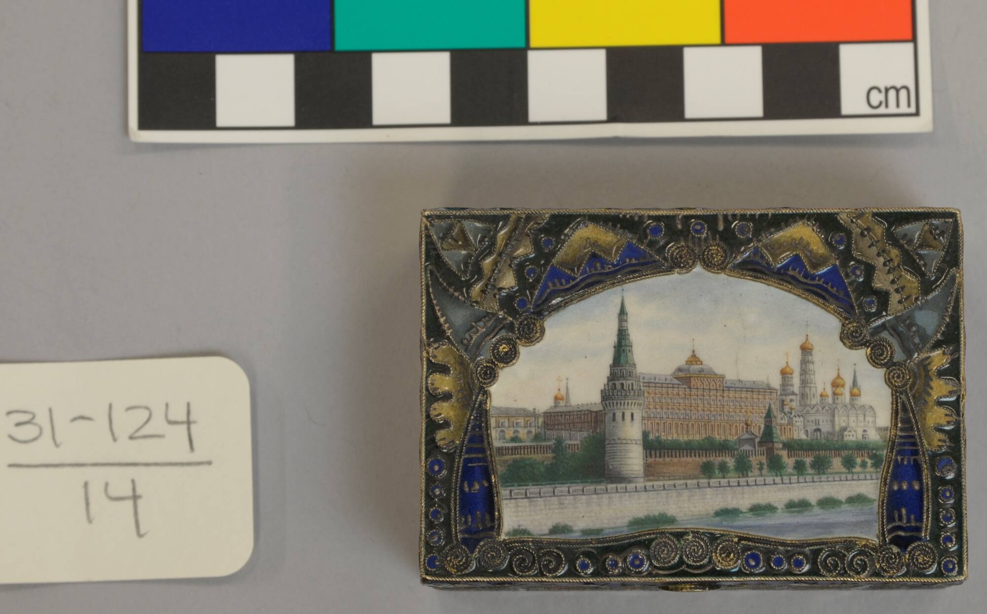 DescriptionDecorated with painted scene of Chateau. Gold with designs in enamel of shades of blue, green, yellow, white, and red.