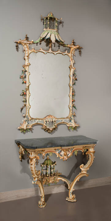 These tables and mirror frames creatively combine an English interpretation of the Rococo style and Asian-inspired designs into whimsical fantasies of pagodas, flowers, fruits and rock formations. The two stacked C-scrolls that compose the tables' bases and the foliage that coils up the mirrors' sides reflect the curvilinear forms favored by the Rococo. The tables' stepped stretchers bridge the legs to form the rocky platform of hanging stalactites that supports the tiled-roof pagoda trimmed with bells. Another pagoda can be found on the top of the mirror along with a domed-roof pavilion at the bottom of the mirror. The two intricately carved pairs are rare and exuberant examples of 18th-century white-painted furniture decorated with polychrome paints and gilding.
