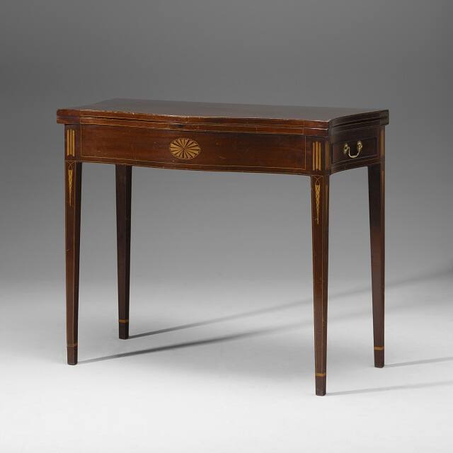 This card table is from a set of four made for Colonel John Cooke of Newport, the birthplace of John Townsend, a renowned Rhode Island cabinetmaker. The table's serpentine sides with drawers indicate that these were custom made, requiring Townsend to fashion the components individually, rather than using stock patterns. The table fronts are ornamented with oval paterae, linenfold motifs and "icicle" designs of inlaid satinwood, a costly embellishment. Tables such as these were used for a variety of activities, including card playing. When in use, the tops were unfolded and supported by the back legs, which swing open; otherwise, the tables were placed against the wall with their tops folded down.