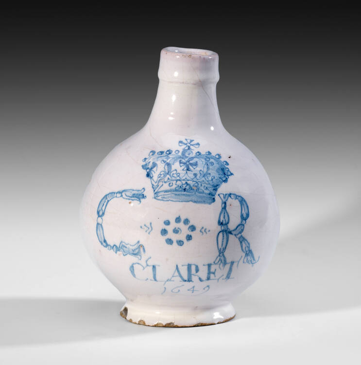DescriptionNarrow-necked, bulbous bodied jub decorated in blue with crown, C.R., "Claret", and the date 1649. Circular base.Gallery LabelThe use of political motifs on 17th- and 18th-century ceramics is much like today's use of political imagery: to display loyalty to a political party or cause. Many of the images of English royalty on the objects in this case were inspired by popular paintings and prints that were translated onto ceramic objects. The large dishes in this case, called chargers, were primarily decorative pieces though they may have been used for serving on special occasions.