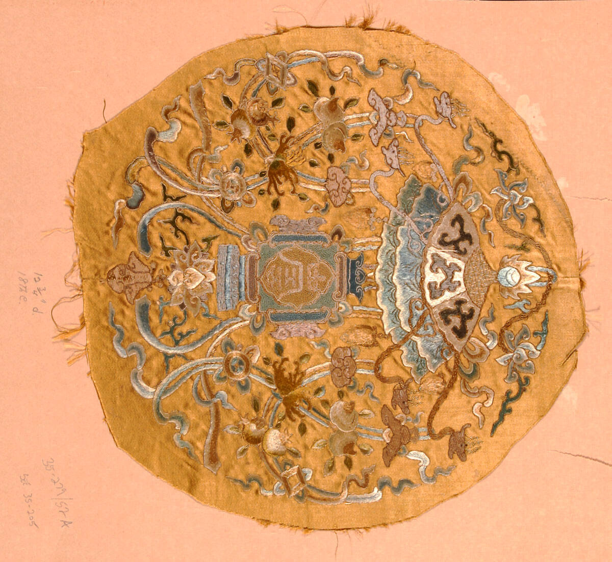 DescriptionCircular medallion from a lady's coat. Gold colored satin embroidered in satin and Peking stitch and couched gold thread. Design of lantern, flowers and fruit. From tomb.
