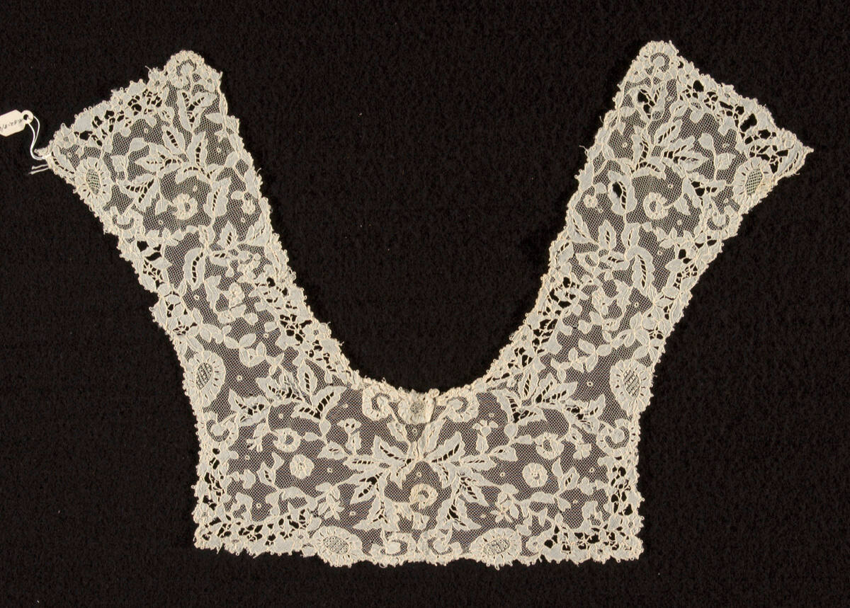 DescriptionCarrickmacross appliqué of fine cotton on machine-made net with simple needle-run fillings and cutwork. Collar cut to fit a U-neck, with a square-cut back and front sections.