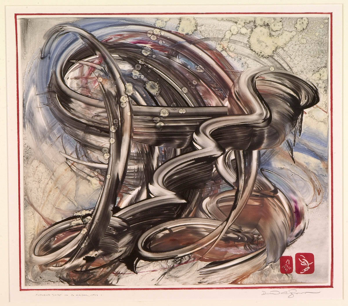 DescriptionTall curving stroke, left, with end spirals, extending top to bottom, connecting, top, with wide, ribbon-like elliptical curve. Zig-zag stroke moving from bottom left to upper right. Shorter spiral below it, from bottom center, above flat circular form, lower right. Mottled and striated ground visible middle left, bottom, lower and upper right, the latter bearing liquid, spreading, black-edged irregular white circles. over spirals, center, top and middle. Two red seals with white devices, lower right corner. Narrow red borader on all sides.