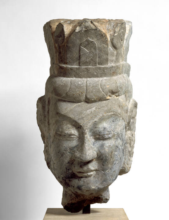 DescriptionCrowned head, facial features in the archaic style of the period including the flat forehead and temples, the high geometric spring of the eyebrows, thin slits of the sloping eyes, the archaic smile and flat, deep-cleft chin. Nose partially restoredGallery Label