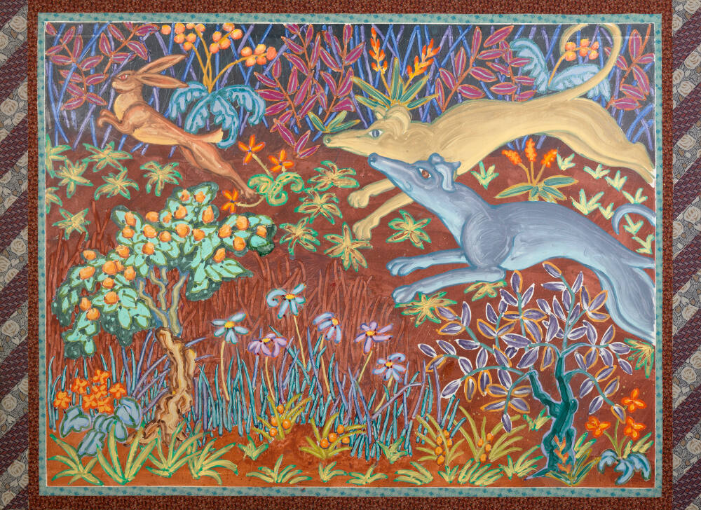 DescriptionPainting of a lush garden with two flowering bushes in foreground and path running horizontally in roughly center of painting. On path, entering from right, are two leaping greyhound-like dogs pursuing a jackrabbit, which is leaping upwards at upper left corner. Circumscribing the painting are three bands of cut polyester double-knit fabric with outer band, at left and right edges, of diagonally laid alternating strips of fabric.Copyright© Bradley Darius
