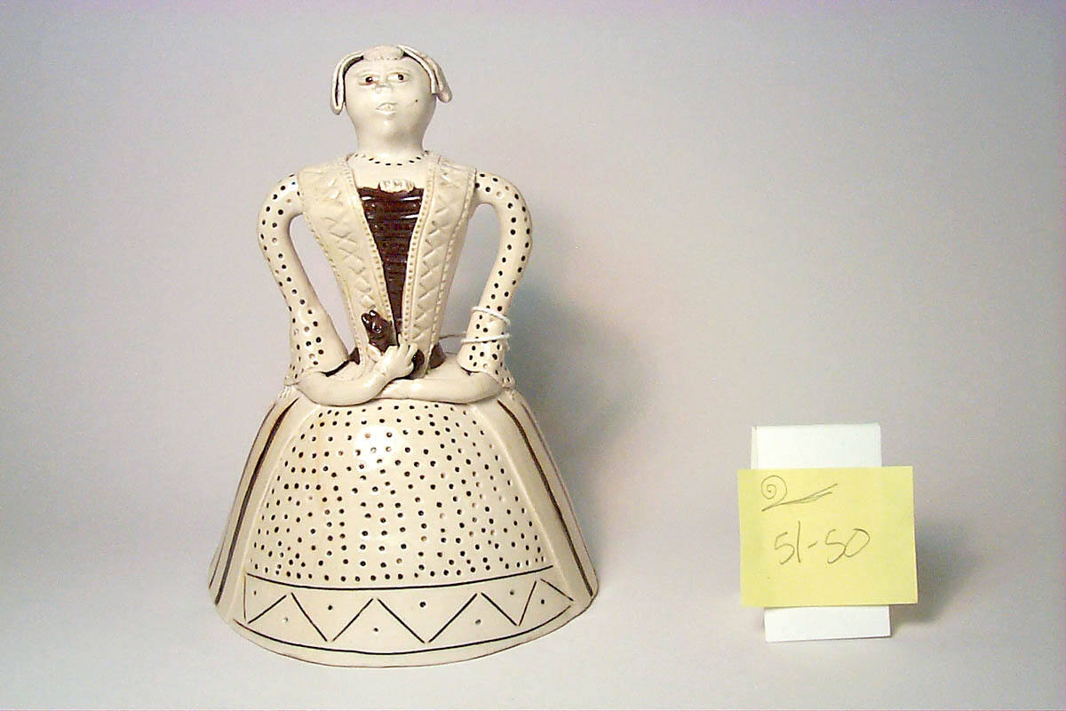 DescriptionLady in a crinoline skirt; hands in front hold a small dog. Impressed designs. Decorated with manganese brown.