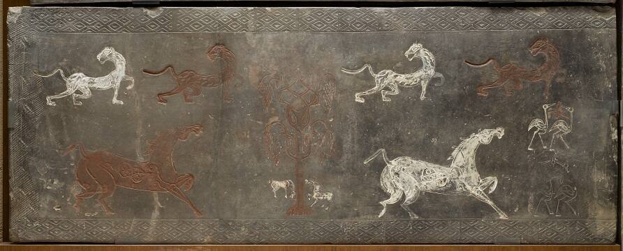 DescriptionGray tile decorated with carvings of horses, tigers, birds, and a tree, colored with red and white pigments, with a geometric border of diamond patterns.
