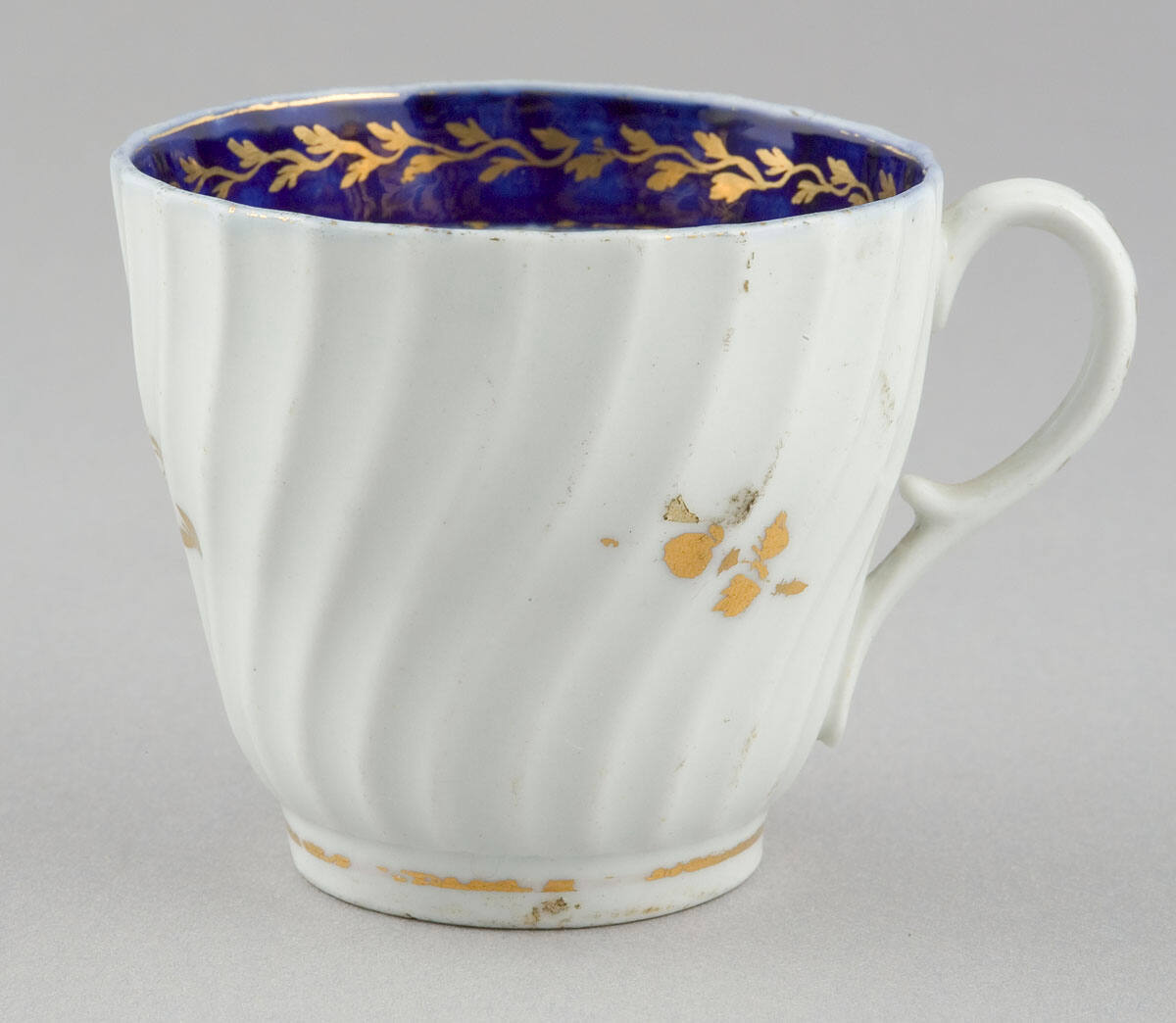 DescriptionWhite porcelain with fluted sides and swan neck handle. Interior border of dark blue edged in gold with gold foliate pattern through center of border. Ring around foot, three flowers on outside of cup and floral motif on handle painted in gold.