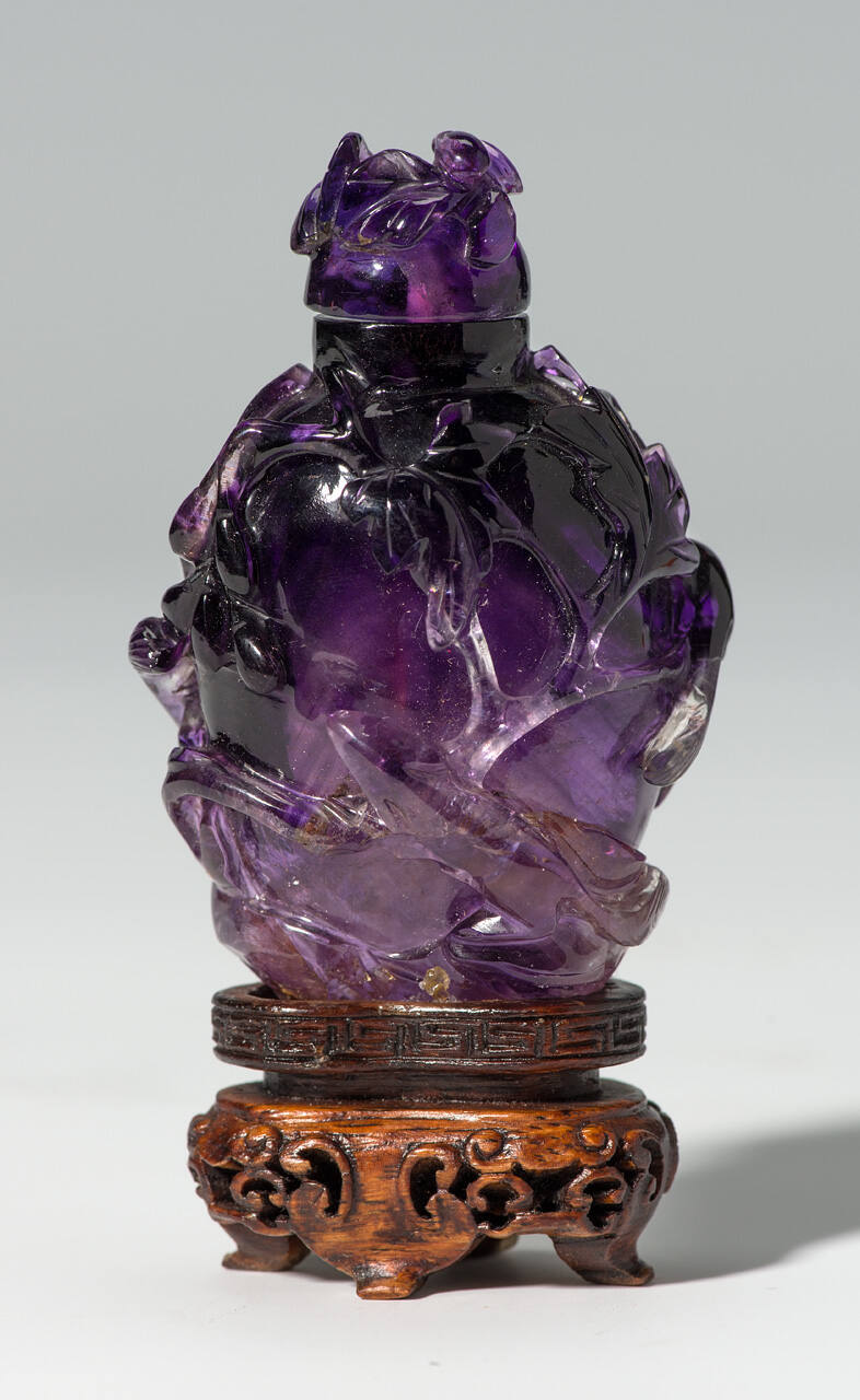 DescriptionThe purplish stone carved in high relief with an overall decoration of three quirrels clambering in the branches of a fruit tree; matching top.