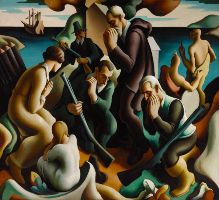 In composing American Historical Epic, Benton rejected traditional mural painting. His series contains no classically inspired personifications of abstract concepts, such as “Truth” or “Progress,” or representations of specific great feats. Rather, it focuses on the shared experiences and struggles of groups of anonymous, ordinary individuals. Benton believed American history was often taught with too much emphasis placed on the actions and accomplishments of “great men.” Filled with undulating forms and vibrant color, the murals also look ahead to Benton’s signature style of painting, which gained widespread attention in the 1930s and ’40s.
