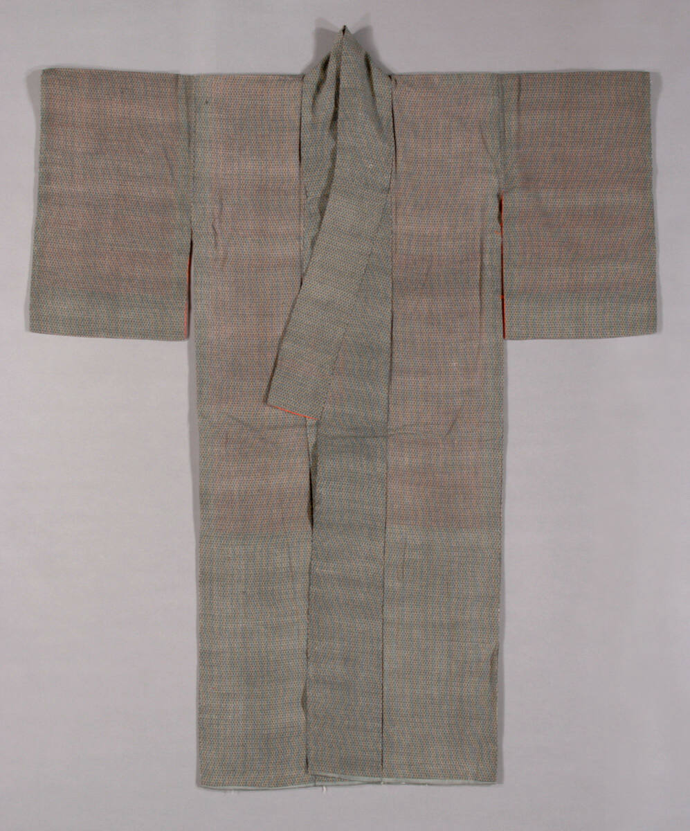 DescriptionGreen silk crepe ground with stencil pattern, red silk lining. Small overall (komon) pattern.