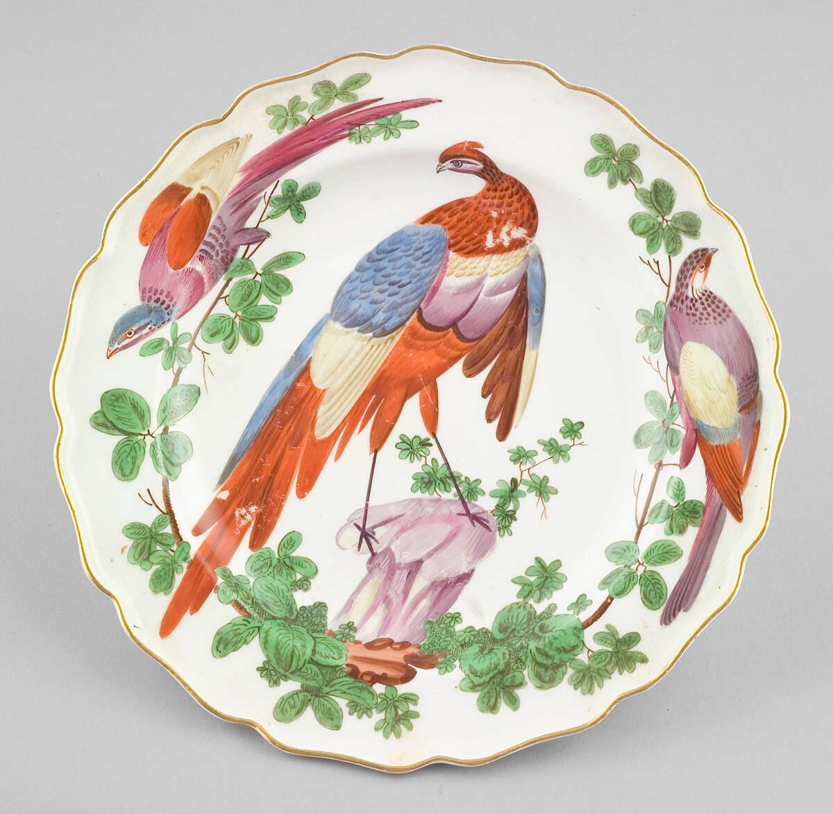DescriptionA white plate with a wavy gilt edge and three exotic birds in varicolored enamel perched on branches and a rock.