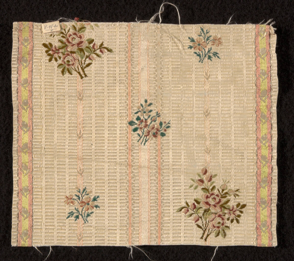 DescriptionCream ribbed silk with green and pink warp stripes; brocade with polychrome silks.
