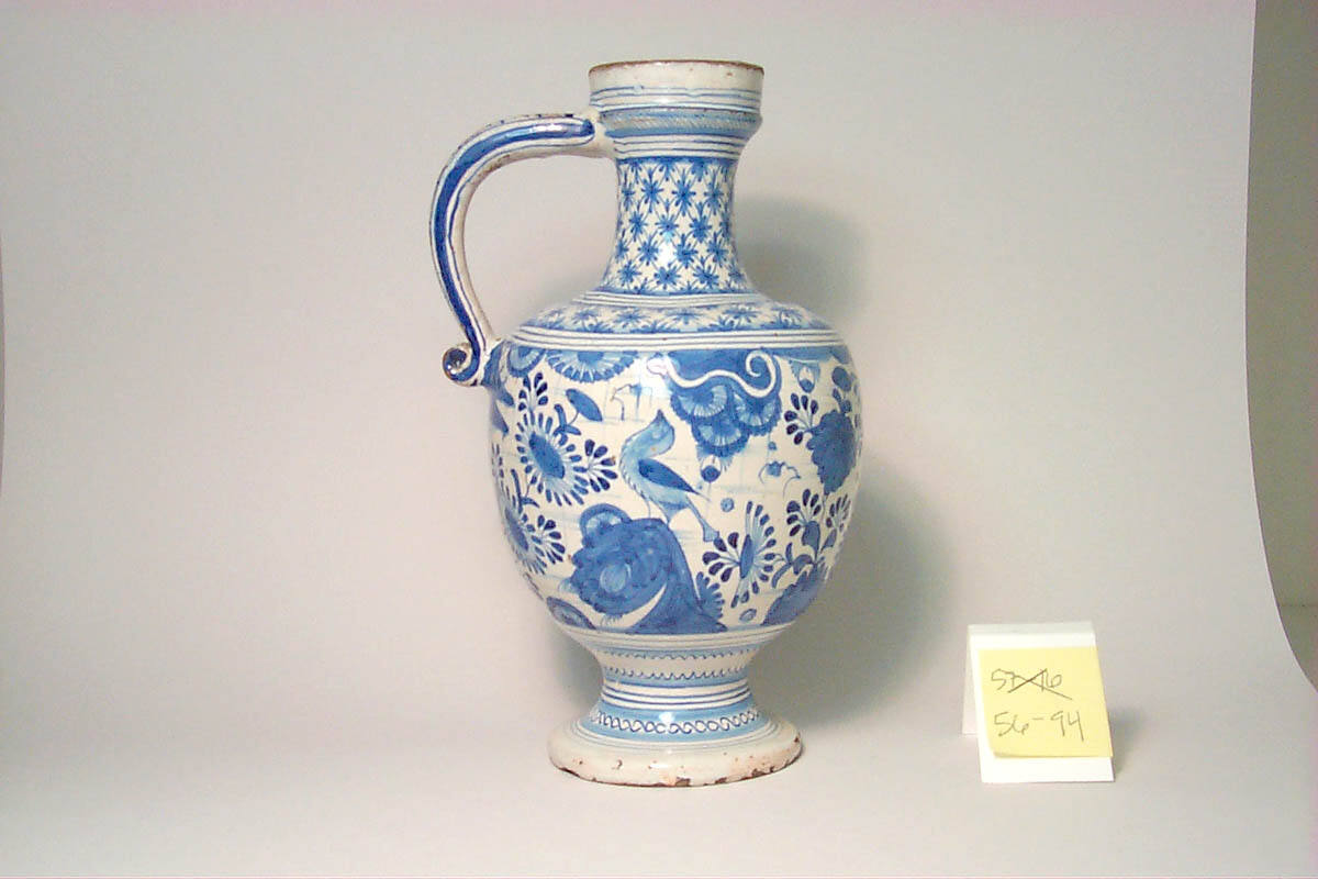 DescriptionOviform, with circular mouth, waisted neck, stout loop handle, and conical foot. Body decorated in Wan Li style with broad band of birds, flowers, and rocks in blue on white ground. On shoulder and neck, bands of florette diaper.