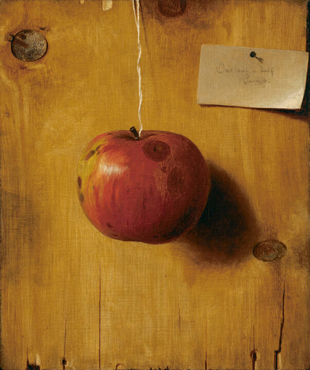 DescriptionAn apple is seen hanging from a white string against a painted wood plank. In the the upper right corner is a painted white card supposedly nailed to the board and inscribed: "One and a half Pounds."Published ReferencesAlfred Frankenstein, After the Hunt: William Harnett and Other