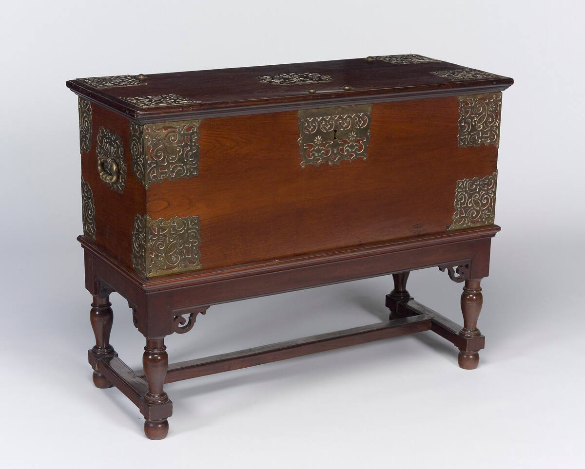 DescriptionRectangular chest with brass mounts on lid and three sides, brass pulls on left and right sides; small drawer to right inside; base with stretchers, four turned legs and corner mounts.ProvenanceVirginia Eaton George (1889-1975), Kansas City, MO, by 1963;