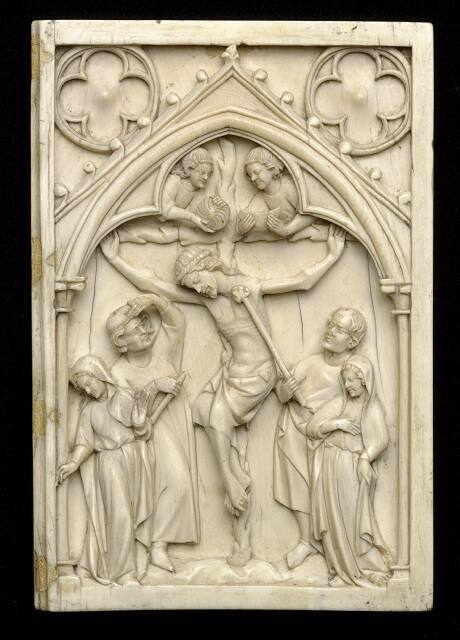 These three intricately carved ivory panels are the right halves of two-panel devotional objects, called diptychs. They depict the Crucifixion of Christ, a popular subject matter for ivory diptychs. In all three, the scene is set within a framework of Gothic architectural elements, including trefoil and pointed arches. Finely formed details in the ivory emphasize the figures' mournful expressions and ornately draped robes.