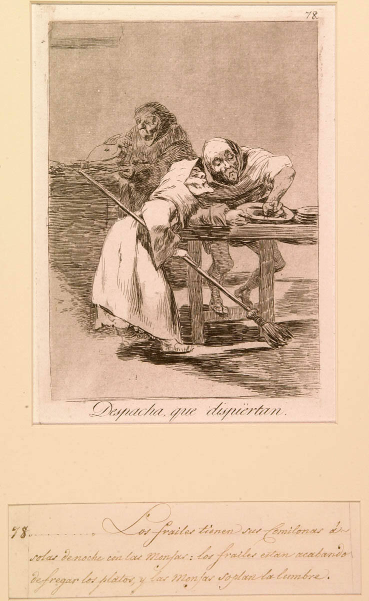 Purchased from Alden Galleries by The Nelson-Atkins Museum of Art, Kansas City, MO, 1933.Tomás Harris, Goya Engravings and Lithographs (Oxford: Bruno Cassirer, 1964), 1: no. 113, pp. 133, 150, (repro.), as Despacha, que dispiertan [sic]. (Be quick, they are waking up); 2: no. 113, p. 156, (repro.), as Despacha, que dispiértan. (Be quick, they are waking up.).