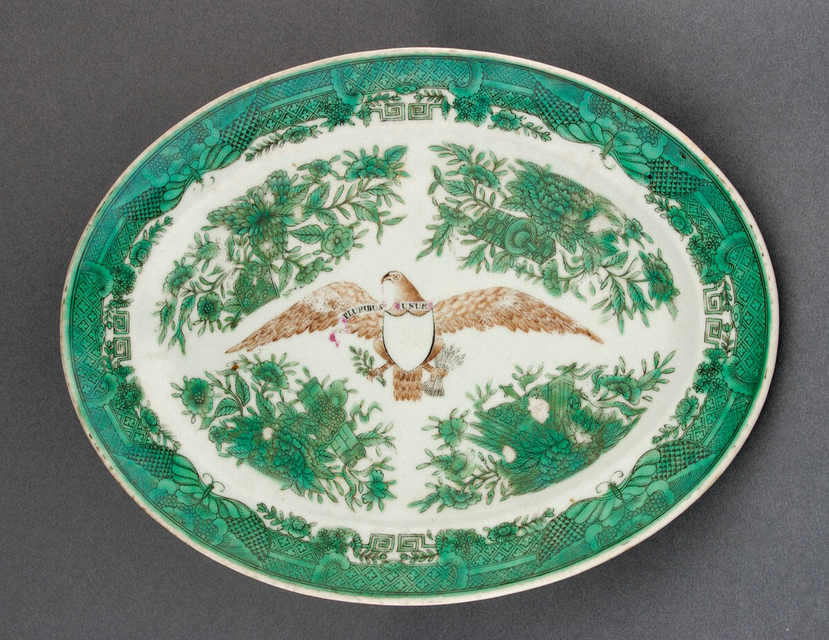 DescriptionPlatter, with green Fitzhugh borders, U.S. arms "E. Pluribus Unum"